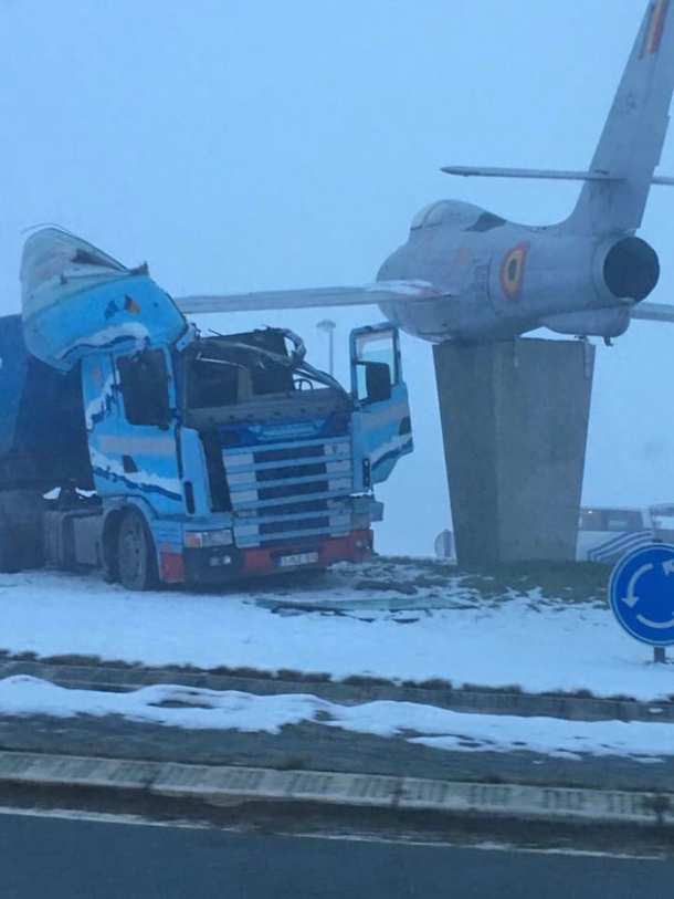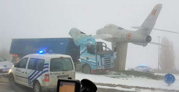 Nici camionul nu zbura, nici avionul nu rula pe autostradă! Dar din cauza condițiilor meteo marcate de polei și ceață, se pare că soferul camionului a derapat în dreptul unui rond unde, pe un piedestal, trona un avion, simbol al aeroportului Florennes din apropiere.