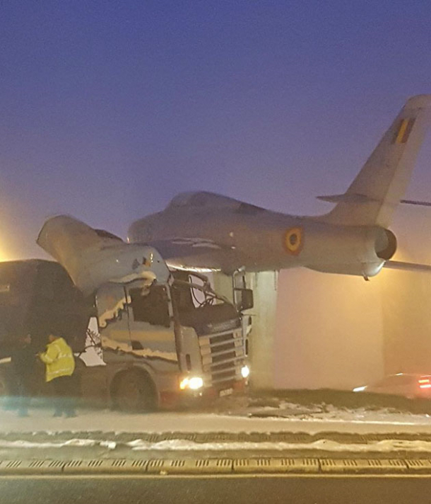 Prin urmare, aripa avionului-monument a acroșat pur și simplu partea de deasupra cabinei lăsând-o… decapotabilă. Aparatul de zbor a rămas în continuare pe piedestal, iar zeci de poze ale șoferilor care au trecut prin zonă au înroșit linia Orange de alertă a autorităților belgiene.
