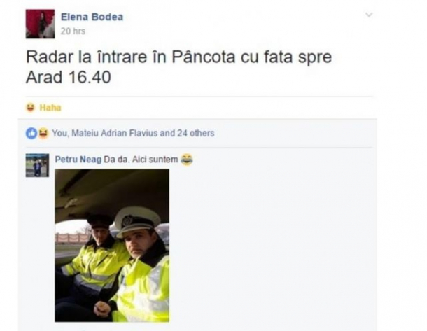 „Radar la intrarea în Pâncota”, avertiza o şoferiţă, pe o pagină de Facebook, participanţii la trafic. Postarea a devenit virală, ajungând chiar și la polițistul care se afla în locația precizată.