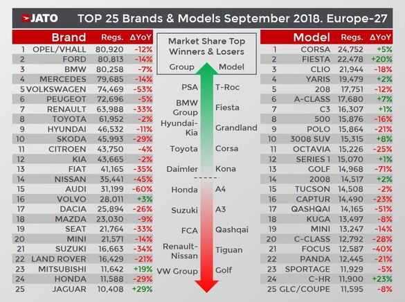 Cel mai vândut model a fost Opel Corsa, care a luat astfel locul lui Volkswagen Golf, tras în jos, alături de celelalte modele ale VW, de întârzierile în omologarea motoarelor. Ford Fiesta, Renault Clio și Toyota Yaris au completat primele 5 locuri în clasamentul vânzărilor din septembrie.