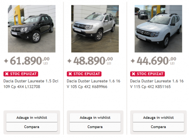 Modelele Dacia Duster Laureate 1.5 DCI 109 CP 4×4, Laureate 1.6 105 CP 4×2 și Laureate 1.6 115 CP 4×2 au fost scoase la vânzare la prețuri reduse de către retailerul Altex, potrivit playtech.ro.