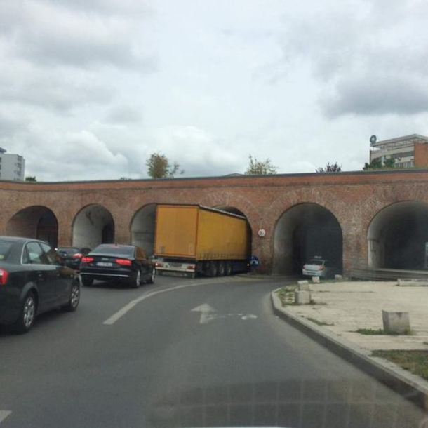 Șoferul unui TIR nu a dat importanță indicatoarelor rutiere și a „forțat” tunelul Bastionului Theresia din Timişoara.