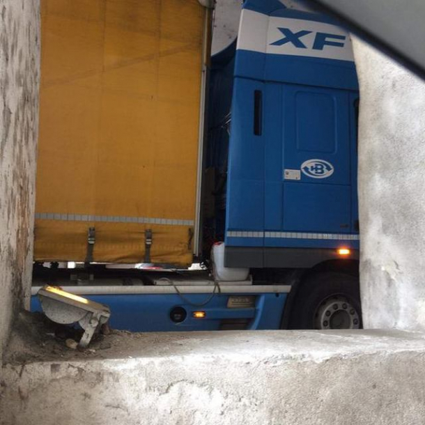 Pe lângă tirul blocat, în imagini se poate observa indicatorul care interzice accesul autovehiculelor care au o înălțime mai mare de 3,3 metri.