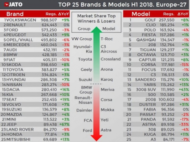La nivel general, Dacia a vândut în primele 6 luni din 2018 un total de 280.410 de mașini și ocupă locul 15. Cel mai vândut brand european este Volkswagen, cu 988.507 unități.