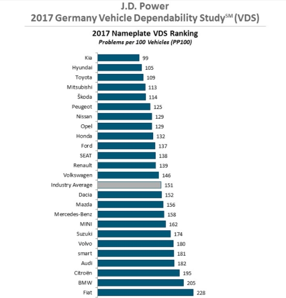 Potrivit unui studiu realizat de J. D. Power, o companie americană de analiză și cercetare de piață, Kia este marca de mașină care a fost considerată cea mai fiabilă de pe piața auto. Studiul a vizat problemele întâlnite de șoferii din Germania după primele 12-36 de luni de folosire ale mașinii.