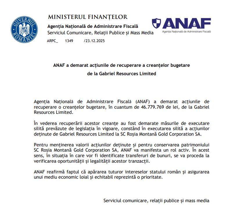„Agenția Național de Administrare Fiscal (ANAF) a demarat acțiunile de recuperare o creanțelor bugetare, în cuantum de 46.779.769 de lei, de la Gabriel Resources Limited.