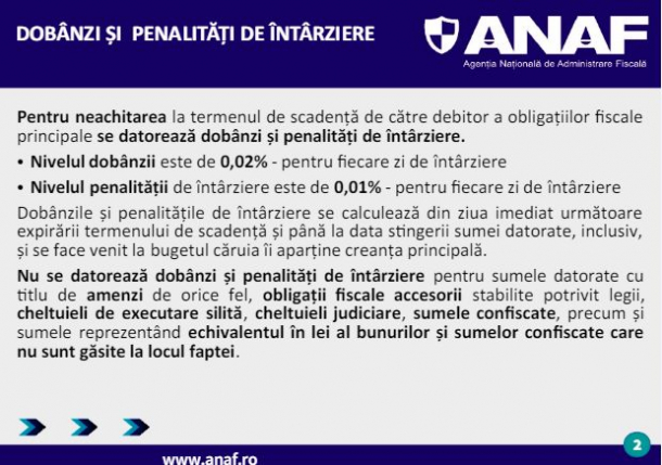 ANAF amintește, într-un ghid pe acest an, că firmele și persoanele fizice ajung să plătească dobânzi și penalități de până la 0,02% pe zi pentru întârzieri la plata taxelor și impozitelor.