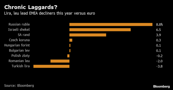 (Foto: Evoluția principalelor monede din piețele emergente (fără America Latină) de la începutul anului / Sursa: Bloomberg)