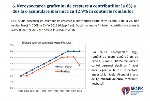 „Din cauza nerespectării legii, românii au acum, după 10 ani de Pilon II, sume cu 12,9% mai mici în contul personal decât ar fi avut dacă legea ar fi fost respectată, iar impactul la nivelul Pilonul II este de 1,1 miliarde de euro (contribuții nevirate)”, a arătat APAPR, într-o prezentare susținută în cadrul unor audieri în Comisia Economica din Senat, conform hotnews.ro.