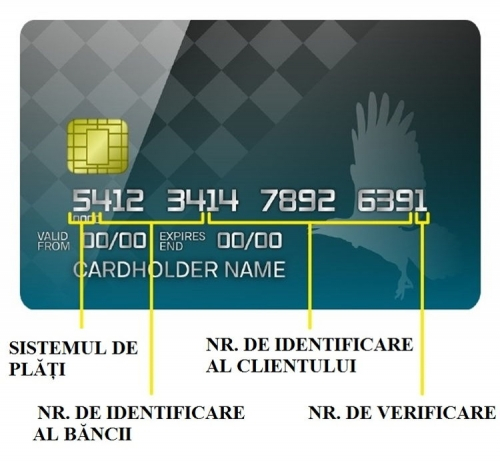 Cele mai multe carduri bancare sunt identificare printr-un număr de 16 cifre Prima identifică sistemul de plăți (4 – VISA, 5 – MasterCard). Următoarele 5 reprezintă codul băncii emitente. Următoarele 9 cifre sunt utile numai pentru bancă, pentru a identifica proprietarul cardului.