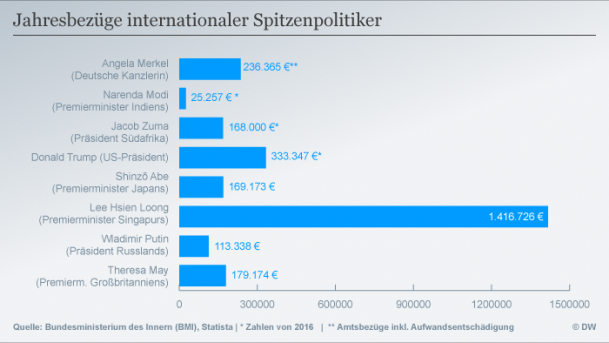 Puţini politicieni de rang înalt câştigă mai mult ca Angela Merkel, printre ei preşedintele SUA cu un venit anual de 333.000 de euro şi premierul Lee Hsien Loong (Singapore) cu aproape 1,5 milioane de euro pe an!