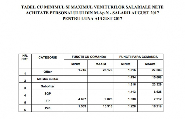 Cât despre cei din categoria Soldați și gradați profesioniști (SGP), cel mai mic salariu a fost de 1.413 lei, în timp ce cel mai mare salariu a fost de 6.625 de lei.