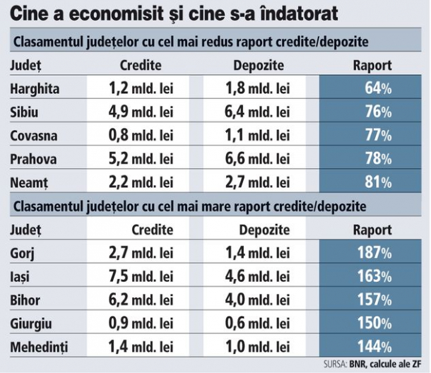 Banca Națională a României a publicat un top al celor mai îndatorate județe. Gorj, Iaşi şi Bihor conduc clasamentul judeţelor cu cel mai dezechilibrat raport între creditetele contractate şi depozitele plasate de populaţie şi companii.