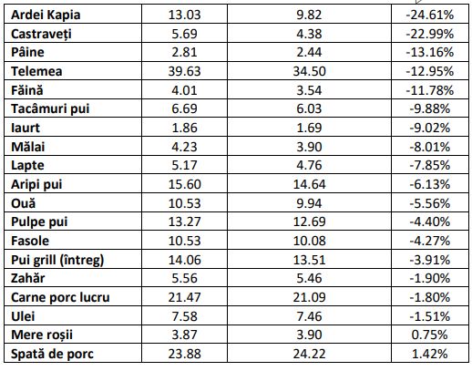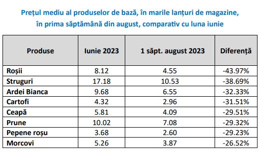 „Preţurile medii ale alimentelor de bază vizate de ordonanţa privind plafonarea adaosurilor comerciale au scăzut cu până la 43% în prima săptămână din luna august comparativ cu luna iunie în marile reţele comerciale.
