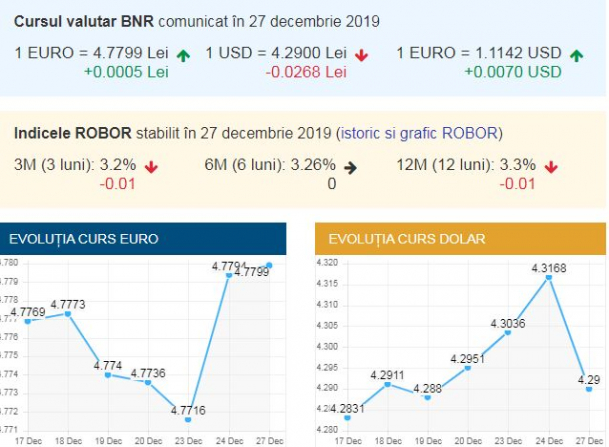 Dolarul scade la 4,29 lei, faţă de 4,31 lei, cursul anunţat pe 24 decembrie de BNR.