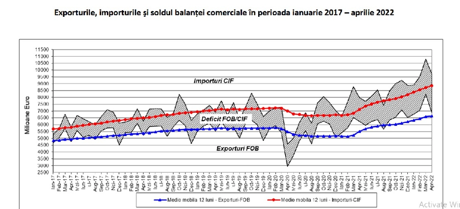În primele patru luni, exporturile FOB au însumat 28,920 miliarde euro, iar importurile CIF au însumat 38,933 miliarde euro, rezultând un deficit de 10,013 miliarde euro. Exporturile au crescut cu 20,7%, iar importurile cu 25,5%, comparativ cu perioada similară a anului trecut, arată datele INS.