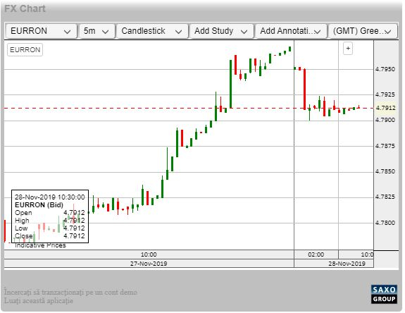 BNR a afișat miercuri un curs de referință de 4.7792 lei pentru un euro. Pe 21 noiembrie euro a atins maximul istoric în faţa leului (4,7808 lei/euro)