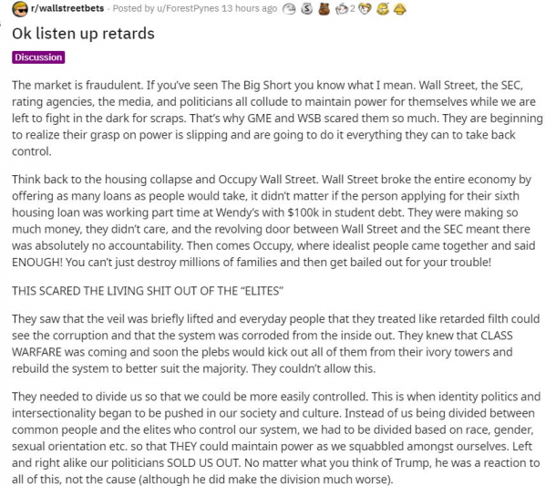 Curentul antielitist care domină fenomenul GameStop iese rapid în evidență dacă arunci o privire asupra discuțiilor care apar pe forumul WallStreetBets: