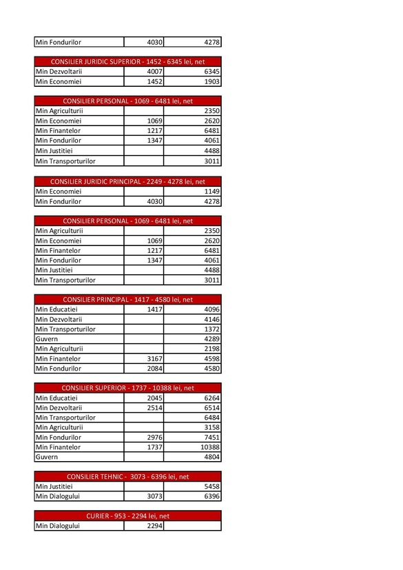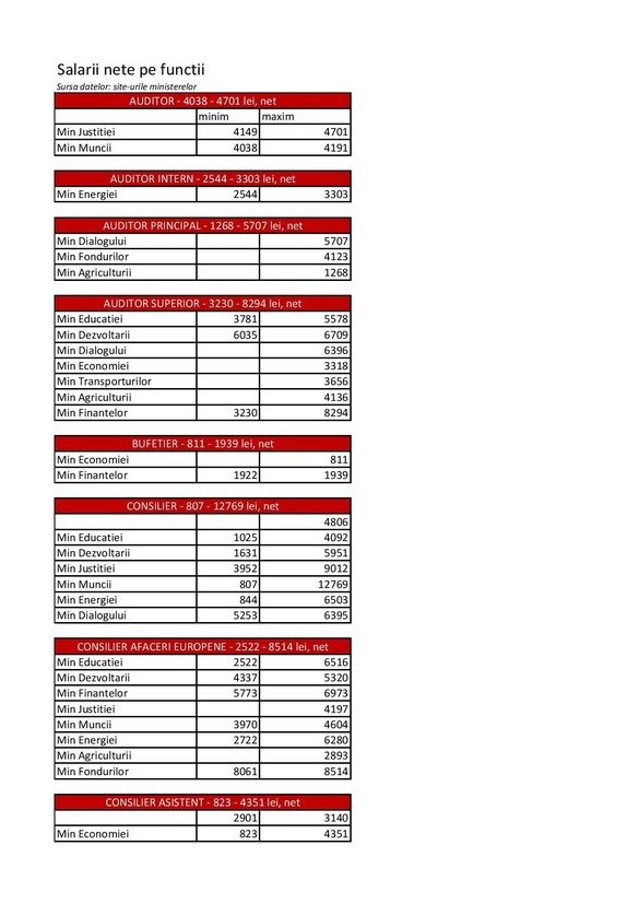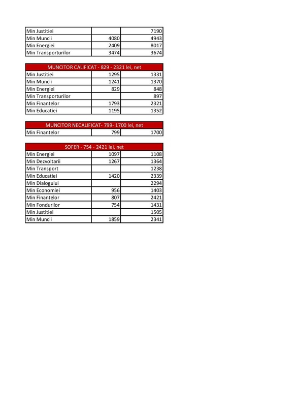 Pe de altă parte, un director de cabinet din Ministerul Dialogului Social are un salariu de 6.395 lei, în timp ce unul de la Ministerul Fondurilor Europene este plătit cu 4.061 lei, iar unul din Ministerul Agriculturii nu depășește 2.270 lei.
