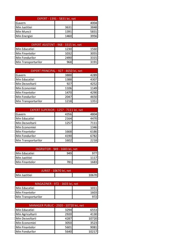 Aceste diferențe dintre ministere și în interiorul unei instituții au condus la cazuri actuale în care cel mai mare salariu net al unui consilier juridic clasa I din Ministerul Economiei, de 2.050 lei, este foarte aproape de cel mai mic salariu net al unui șofer de la Ministerul Muncii și mai mic decât cel mai mare salariu al unui șofer din același minister.