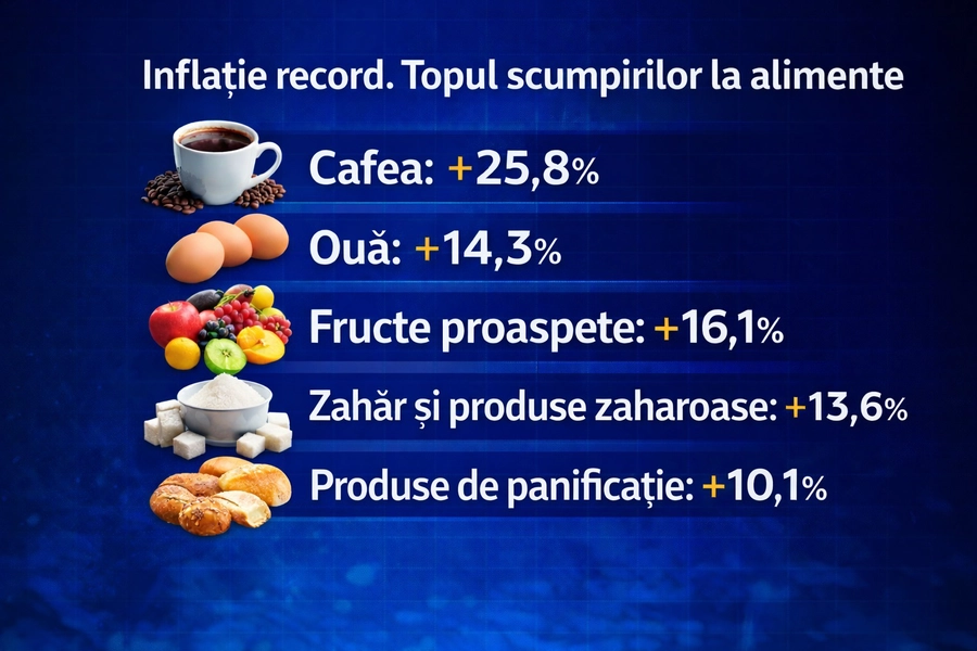 În categoria alimentelor, cele mai mari scumpiri din ultimul an s-au înregistrat la cafea, unde prețul a crescu cu 25,82%.