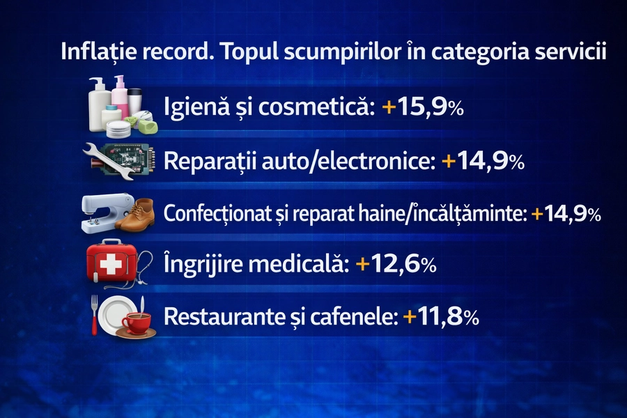 Tarifele au crescut și la reparațiile auto (+14,90%), serviciile de confecționat și reparat încălțăminte și îmbrăcăminte (+14,86%), iar asistența medicală s-a scumpit cu 12,59%.