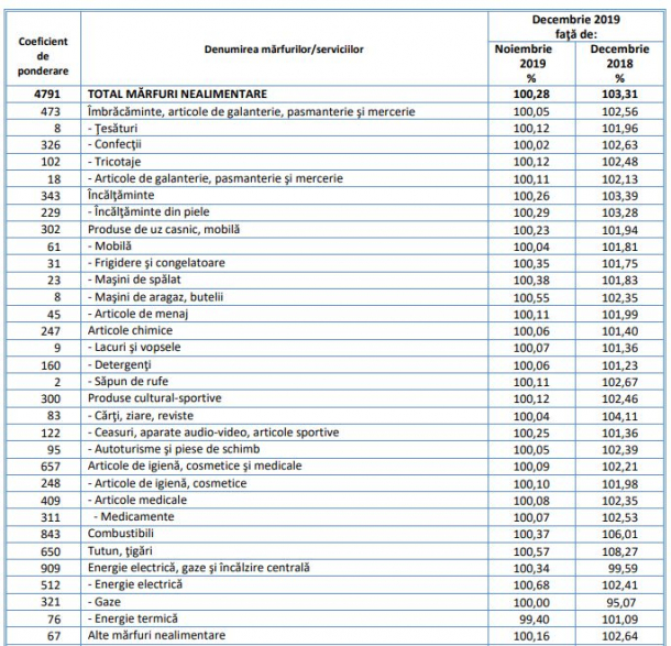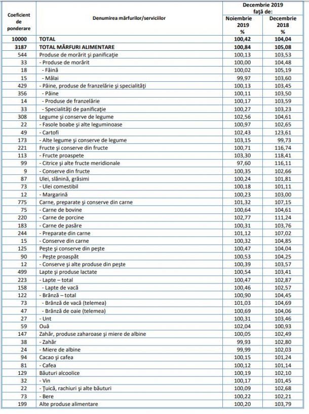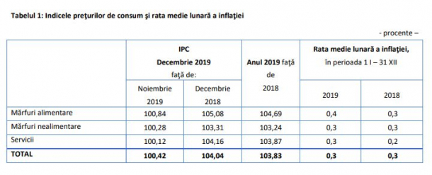 „Preţurile de consum în luna decembrie 2019 comparativ cu luna decembrie 2018 au crescut cu 4,0%. Rata anuală calculată pe baza indicelui armonizat al preţurilor de consum (IAPC) este 4,0%.