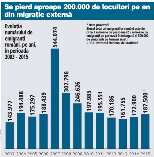 Numai în 2015, ultimul an pentru care există date, au plecat circa 190.000 de români în străinătate, număr în uşoară creştere faţă de anul anterior. Cel mai mare val de migraţie externă a fost însă în 2007, primul an de după intrarea României în Uniuniea Europeană, când jumătate de milion de români au plecat la muncă în străinătate.