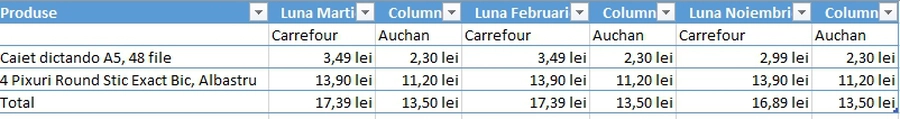Dacă e să comparăm martie cu noiembrie, la Carrefour prețul pentru cele două categorii de rechizite a crescut cu 0,5 lei, adică 2,96%. La Auchan, prețurile nu s-au modificat deloc, au rămas la fel.