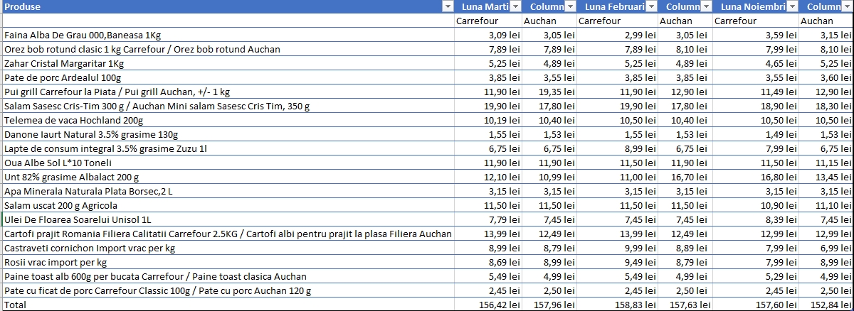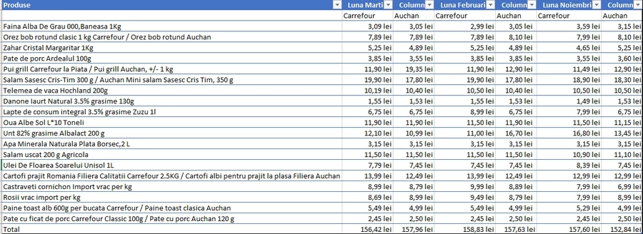 De asemenea, comparând costul din luna martie cu luna noiembrie, luna în care am început monitorizarea, la Carrefour, prețul total al coșului cu alimente a scăzut cu 1,18 lei, adică cu 0,75%.