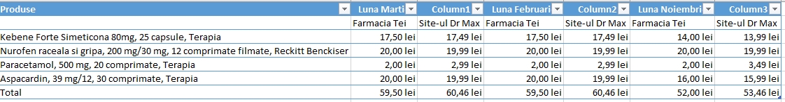 Dacă e să facem o comparație între luna martie și luna noiembrie, prețurile la medicamentele selectate au crescut la Farmacia Tei cu 7,5 lei, adică 14,42%.