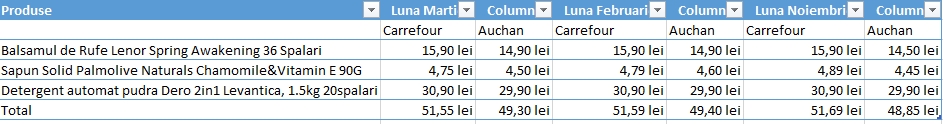 De asemenea, comparând luna martie cu luna noiembrie, la Carrefour, costul total al coșului cu produse de curățenie a scăzut cu 0,14 lei, adică cu 0,27%.