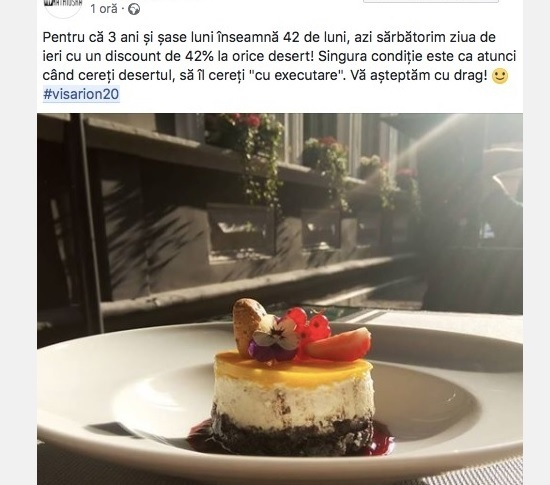 Astfel, cei care vor trece pragul localului vineri vor putea beneficia de o reducered de 42% (3 ani și 6 luni de închisoare înseamnă 42 de luni) la orice desert cu condiția ca atunci când fac comanda să ceară ”cu executare”.