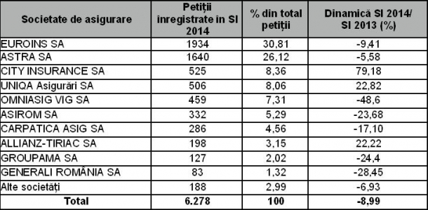 În perioada ianuarie – iunie 2014, numărul petițiilor din sectorul asigurări înregistrate în mod unic pe petent, analizate și soluționate s-a cifrat la 6.278, în scădere cu 8,99% față de perioada similară a anului trecut.