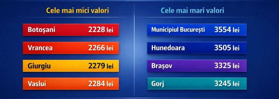 Astfel, cele mai mici valori ale pensiei medii lunare de asigurări sociale de stat s-au înregistrat în județele Botoșani (2228 lei), Vrancea (2266 lei), Giurgiu (2279 lei) și în Vaslui (2284), iar cele mai mari valori ale pensiei medii lunare de asigurări sociale de stat s-au înregistrat în București (3554 lei), Hunedoara (3505 lei), Brașov (3325 lei) și Gorj (3245 lei).