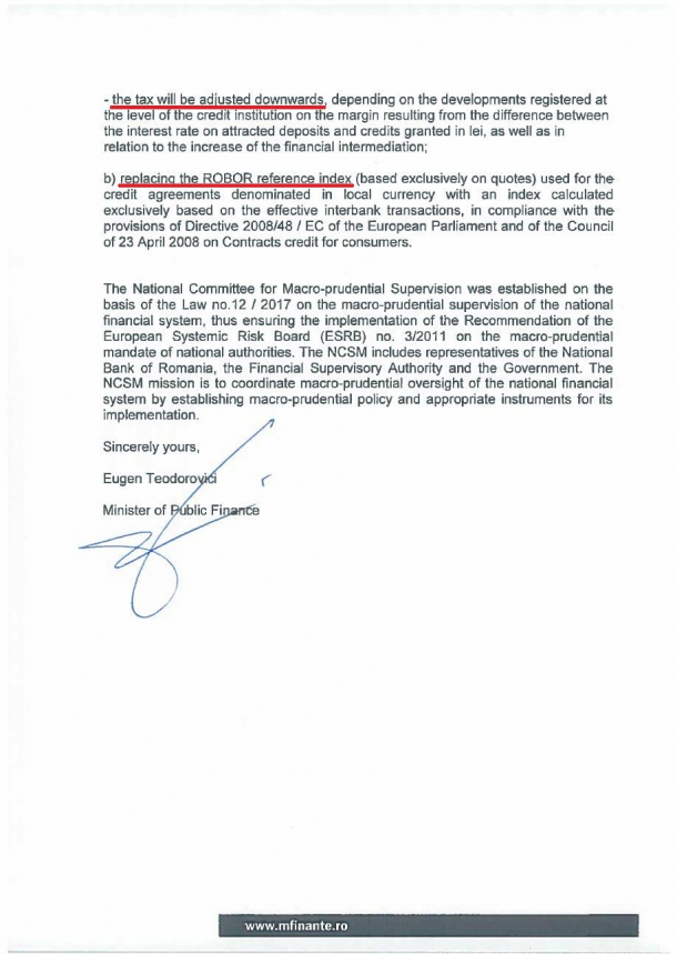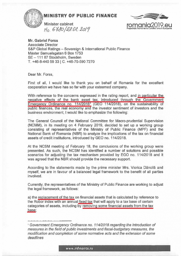 În scrisoarea semnată de ministrul Finanțelor, Eugen Teodorovici, și făcută publică de deputatul USR, Claudiu Năsui, se promite că, în schimbul păstrării perspectivei stabile a României, vor fi eliminate din baza de calcul a taxei anumite active, că va fi micșorată și că va fi eliminată referința ROBOR.