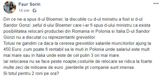 Secretarul Cartel Alfa Satu Mare, Sorin Faur, a scris pe Facebook, că, în timpul discuțiilor, ministrului Muncii i s-ar fi transmis că există posibilitatea relocării producției din România în Polonia și Italia.