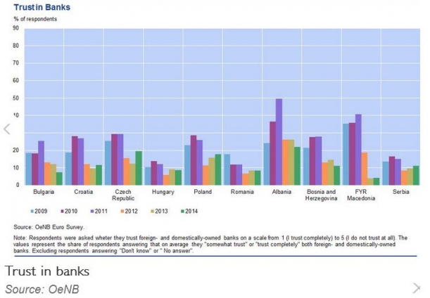 Românii stau mai prost cehii, croaţii sau polonezii la capitolul încredere în bănci și se situează aproximativ la același nivel cu bulgarii și maghiarii.