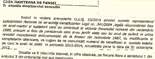 „Având în vedere prevederile OUG 53/2010, privind sumele restante reprezentând indemnizații restante ce se achită benficiarilor legii nr. 341/2004, legea recunoștinței față de eroii-martiri și luptătorii care au contribuit la victoria Revoluției române din decembrie 1989, …vă rugăm să ne comunicați numărul de beneficiari și sumele exacte pe care le aveți de plătit în perioada 2012-2014, actualizate până la data de 31 octombrie 2012.