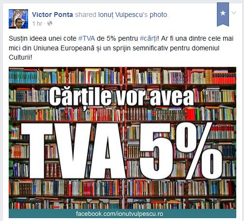 „Susțin ideea unei cote de TVA de 5% pentru cărți! Ar fi una dintre cele mai mici din UE”, a scris Ponta pe Twitter.