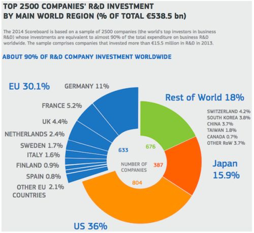 Comisia Europeană a publicat rezultatele privind investițiileîn cercetare și dezvoltare. Astfel, companiile cu sediul în Uniunea Europeană au investit peste 160 miliarde de euro în 2013, pe când societățile din SUA au investit 193 miliarde de euro, iar cele cu sediul în Japonia – 85 miliarde de euro.
