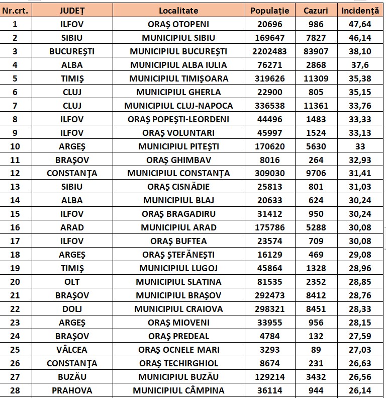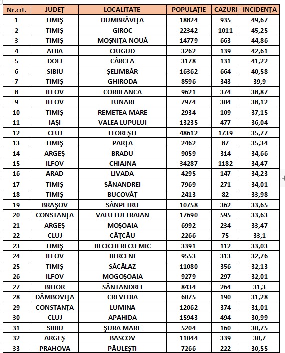 Cea mai mare rata de infectarea este înregistrată în Dumbrăvița, județul Timiș (49.67), Giroc, județul Timiș (45.25), Moșnița Nouă, județul Timiș (44.86), Ciugud județul Alba (42.61), Cârcea, județul Dolj (41.22), Șelimbăr, județul Sibiu (40.58), Ghiroda, județul Timiș (39.9), Corbeanca, județul Ilfov (38.87), Tunari, județul Ilfov (38.12) și Remetea Mare, județul Timiș (37.15).