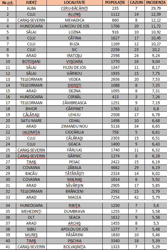 În ceea ce privește situația localităților, 238 dintre acestea au rata de incidență mai mare de 3 la mia de locuitori. Cei main mari indici se înregistrează în Ceru-Băcăinți, județul Alba (29,79), Aluniș, județul Cluj (12, 59) și Mehadica, Caraș Severin (12,12).