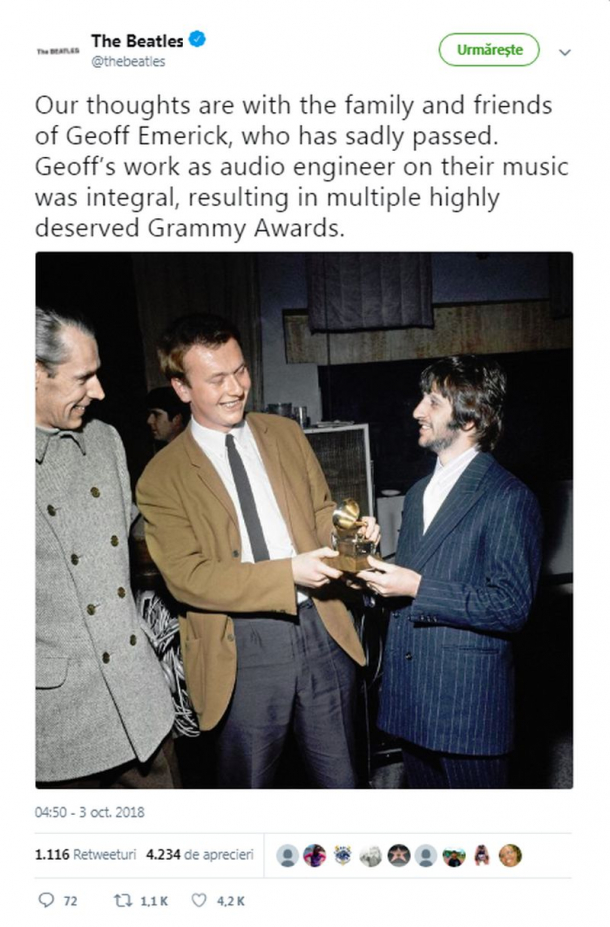 Geoff Emerick, inginerul de sunet care a ajutat la crearea sound-ului Beatles, a încetat din viaţă la 72 de ani.