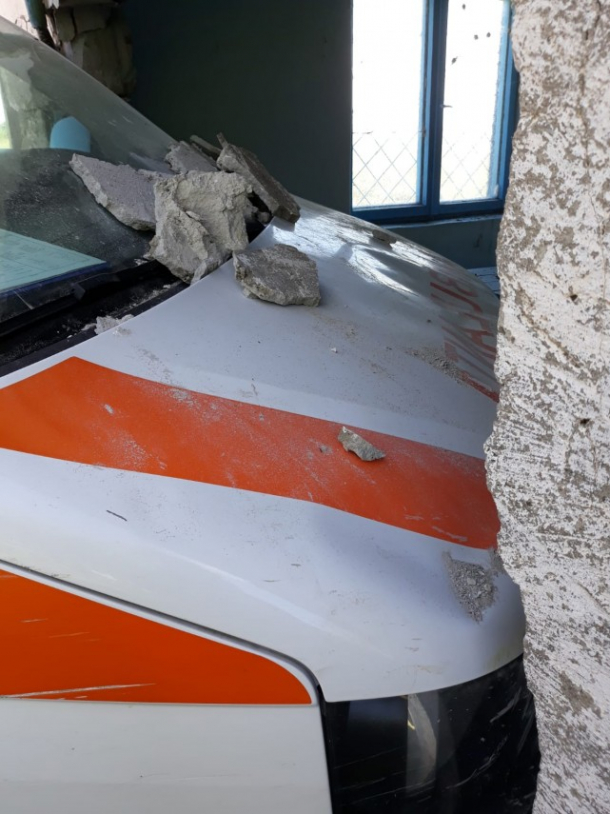 Pentru a evita impactul cu un autotren al căruișofer nu s-a asigurat când a vrut să schimbe direcția de mers, ambulanțierul a tras stânga de volan iar autospeciala a intrat în zidul clădirii.
