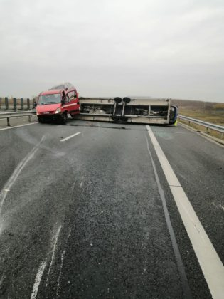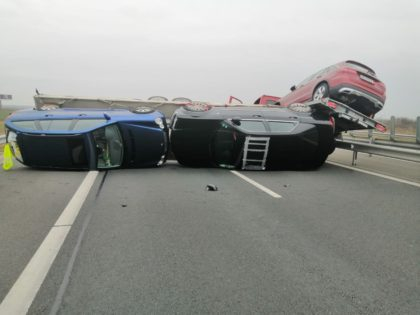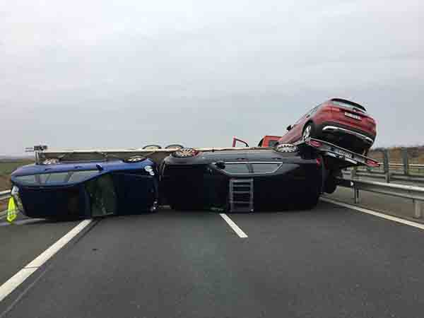 Scenă desprinsă parcă din celebra serie „Fast and Furious” pe autostrada A1. Un autovehicul care transporta mai multe autoturisme s-a răsturnat și a blocat drumul în cursul acestei dimineți, la km 574, calea 2, Nădlac-Arad, informează Arad24.