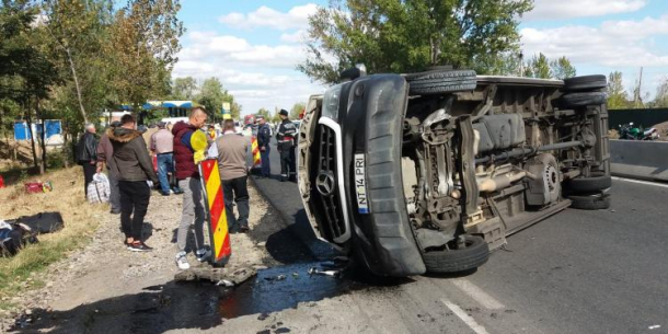 Un accident cumplit a avut loc pe Drumul European 584, pe sensul de mers Brăila-Viziru, unde un microbuz plin cu pasageri s-a lovit de parapet și s-a răsturnat.