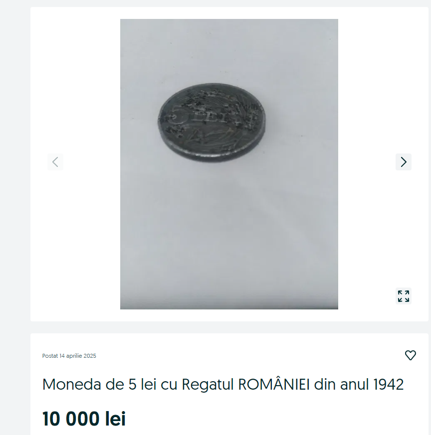 Este vorba despre moneda de 5 lei, care a fost emisă în anul 1942. În acest moment, potrivit unui anunț publicat pe OLX, o astfel de monedă se vinde cu suma de aproape 10.000 de lei.