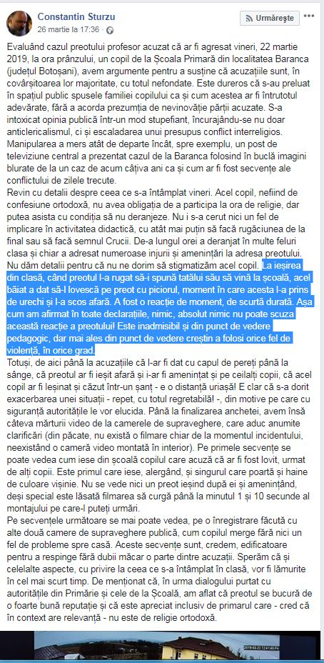 ”La ieșirea din clasă, când preotul l-a rugat să-i spună tatălui său să vină la școală, acel băiat a dat să-l lovească pe preot cu piciorul, moment în care acesta l-a prins de urechi și l-a scos afară. A fost o reacție de moment, de scurtă durată. Așa cum am afirmat în toate declarațiile, nimic, absolut nimic nu poate scuza această reacție a preotului! Este inadmisibil și din punct de vedere pedagogic, dar mai ales din punct de vedere creștin a folosi orice fel de violență, în orice grad. Totuși, de aici până la acuzațiile că l-ar fi dat cu capul de pereți până la sânge, că preotul ar fi ieșit afară și i-ar fi amenințat și pe ceilalți copii, că acel copil ar fi leșinat și căzut într-un șanț – e o distanță uriașă!”, a scris Constantin Sturzu, pe Facebook.