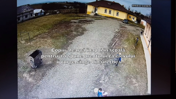 Totodată, în videoclip se poate vedea cum din incinta școlii iese chiar preotul-profesor, care se urcă în mașină și pleacă fără a opri să vadă care era starea copilului.